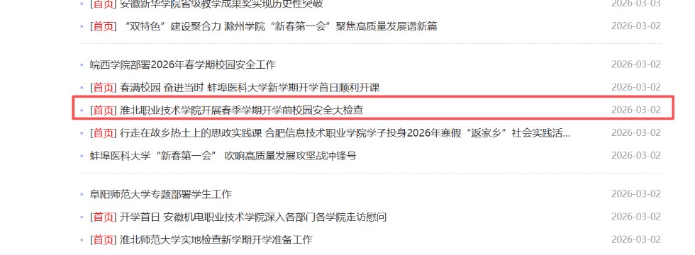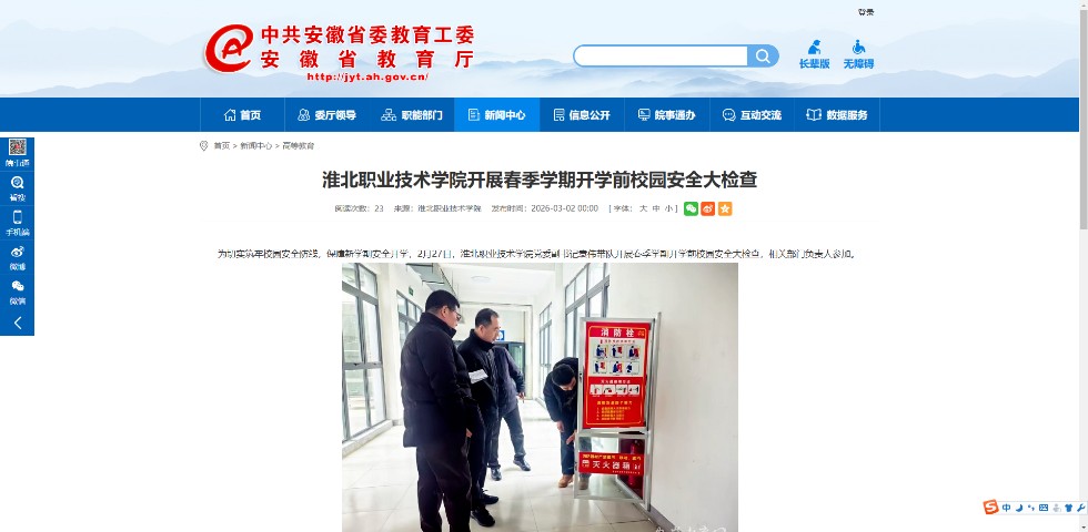 3月2日 91香蕉视频IOS官方,安徽教育网首页以“香蕉视频黄在线观看开展春季学期开学前校园安全大检查”为题,报道了我院开展校园安全大检查,保障新学期安全开学的情况。